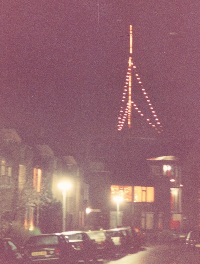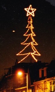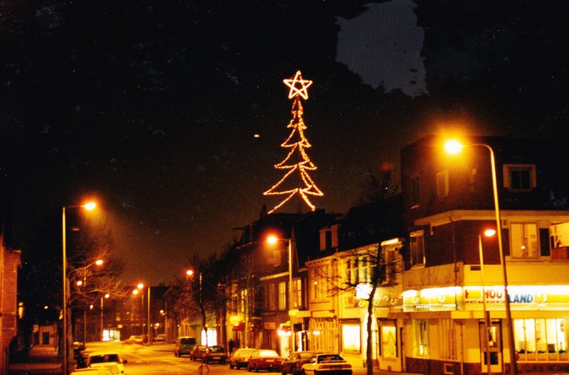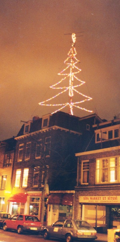 Ja, hij lijkt er best wel een beetje op, alleen dan met veel meer gloeilampjes want ledverlichting, dat moest nog worden uitgevonden. Het gaat hier om een boom op een dak in Amsterdam Noord uit de jaren 80, Ook een boom die je niet kon missen als je vanuit het noorden richting het centrum van Amsterdam ging via de IJtunnel.